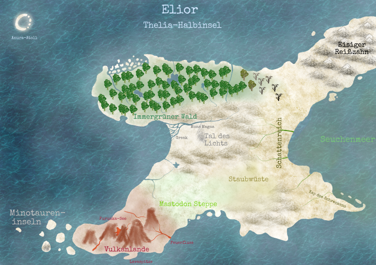 Die Welt Elior ist groß. Besonders Augenmerk sollte jedoch vor allem dem Kontinent Thelia gewidmet werden. Die Landschaft ist ebenso vielseitig wie ihre zahlreichen Bewohner. Dies liegt vor allem daran, dass die Leylinien der Sphären, die nach Elior führen, größtenteils direkt oder sehr nah an Thelia vorbeiführen.